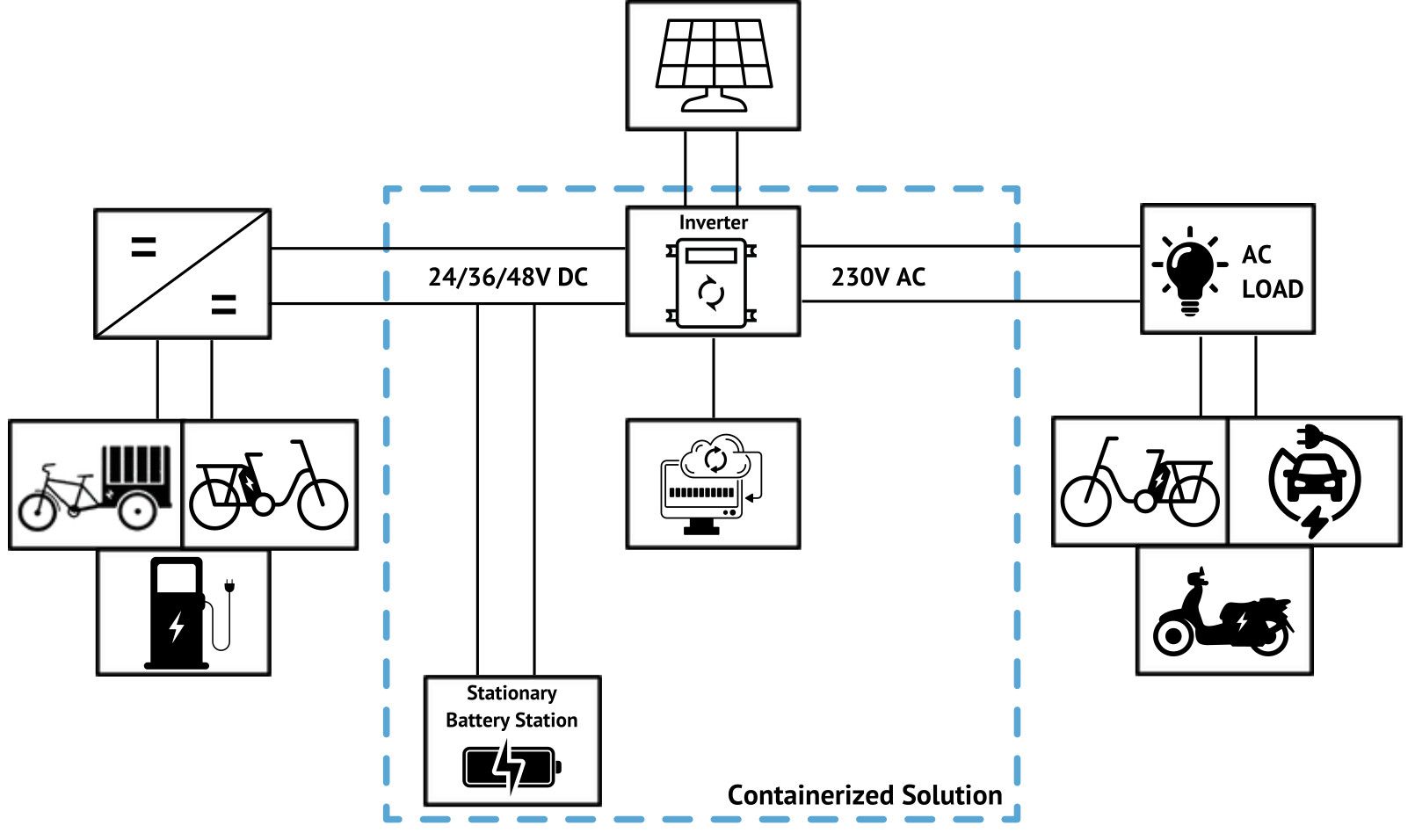This replicable hub supports charging for more than 10 e-bikes, powers both in-use and spare swappable batteries, and can be customized with added features such as: